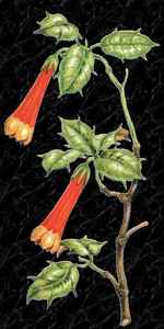 Je to keř dosahující výšky 30-180cm. Listy má jednoduché, lesklé, tmavě zelené, vejčité a osténkatě zubaté. Trubkovité květy jsou červené, na obvodu koruny žluté. Plodem tohoto keře je bílá nebo zelenožlutá bobule s velkým počtem lesklých semen. |