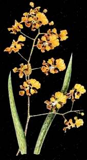 Tato tropická orchidej je v Americe široce rozšířená. Pseudocibulky svou velikostí spíše připomínají zduřelý oddenek, z kterého vyrůstají dužnaté, přímé, zakulacené, šedozelené listy s charakteristickými fialovými skvrnami. Svěšené klasovité květenství vyrůstá na zelené stopce, s typickými purpurovými nebo purpurově hnědými skvrnami. Květy mají hnědožluté kališní lístky a jejich korunní plátky jsou pokryty temně hnědými skvrnami. Trojlaločnatý jazýček je jasně žlutý s červenohnědými skvrnami. Květ měří napříč, přes střední laloky, 3cm a jeho délka je 2cm. |